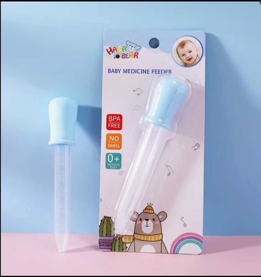 El dosificador de medicamentos tiene forma de pipeta con una punta de silicona suave para la comodidad del bebé, esta hecho de plástico libre de BPA y sin color, permite dosificar la cantidad exacta de medicamento líquido, con marcas en milímetros (ml), es adecuado para bebés desde los o meses, para usarlo se presiona la pera de goma para succionar el medicamento y luego se administra al bebé.